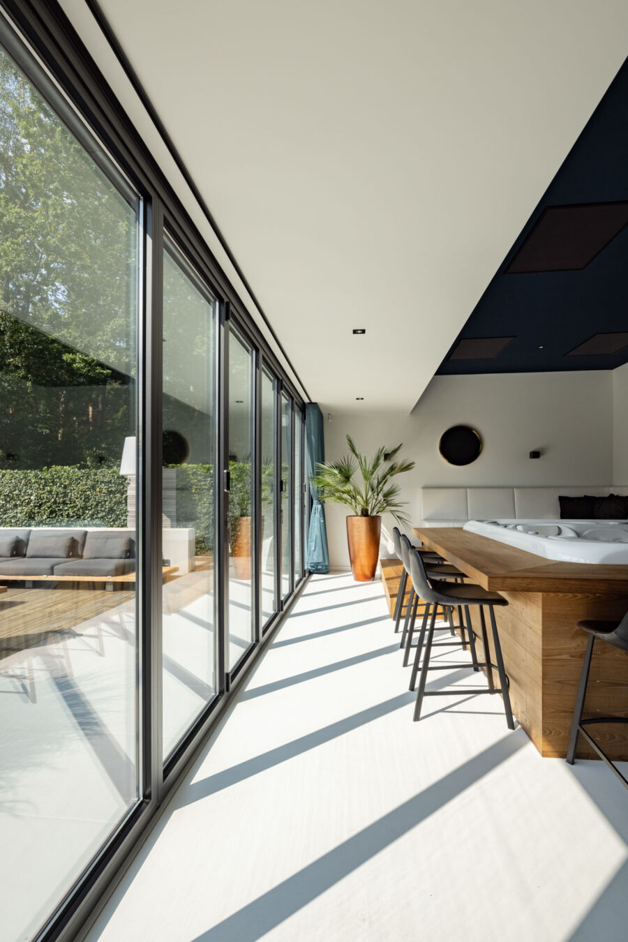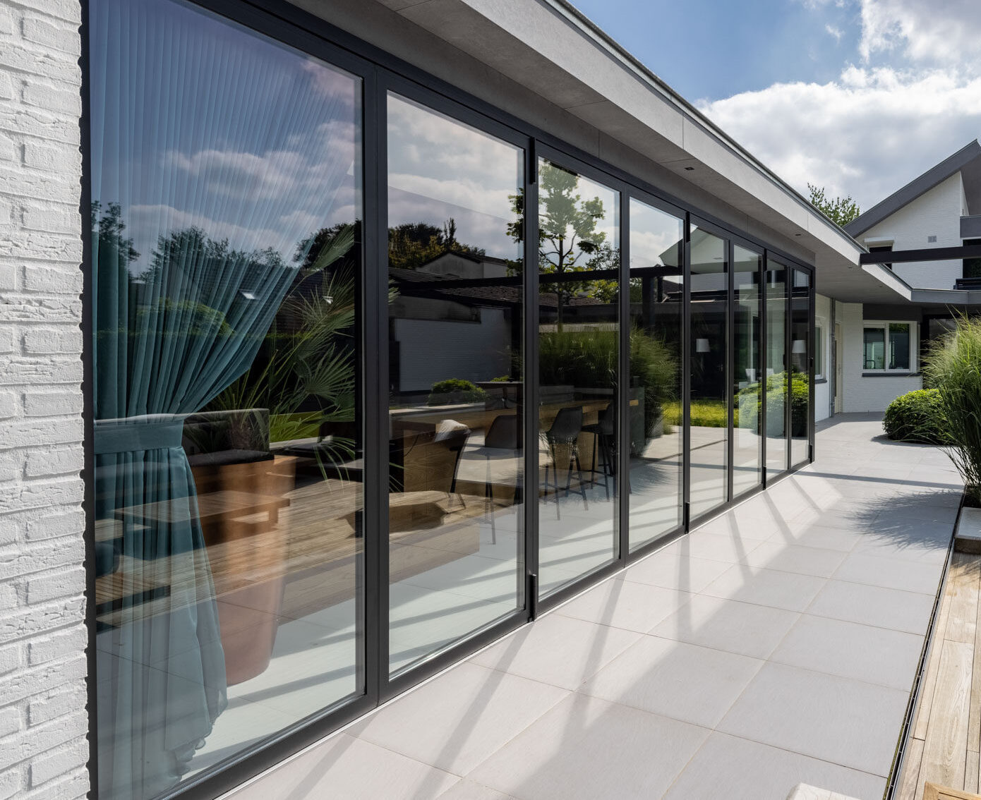 Dankzij de combinatie van strakke aluminium profielen en grote glasoppervlakken creëer je een moderne, open uitstraling. Dit zorgt voor een naadloze verbinding tussen binnen en buiten: je woonkamer en terras smelten samen tot één grote leefruimte.